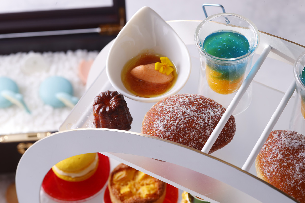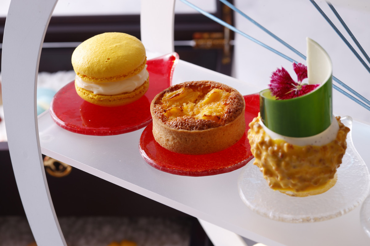【メニュー】(上段)ジュレ マンダリン ブルー / ハワイアンドーナッツ マラサダ / カヌレ・ド・ボルドー / 赤パプリカのバヴァロア スパイシートマトソース(中段)マカロン ヴェルヴェーヌ / タルト アナナス ココ / ムース ヴァニーユ アナナス(下段)コンソメジュレとホワイトアスパラのヴルーテ キャビア“ダヴィンチ”とフレーバーオイル / 小海老のタルトレットオーロラソース シェリークリーム / 鶏のガランティーヌとプティポワフランセーズ / ノワール・ド・ビゴールのインダイレクトロティ“クラブハウスサンド ザ・カハラ 横浜スタイル”