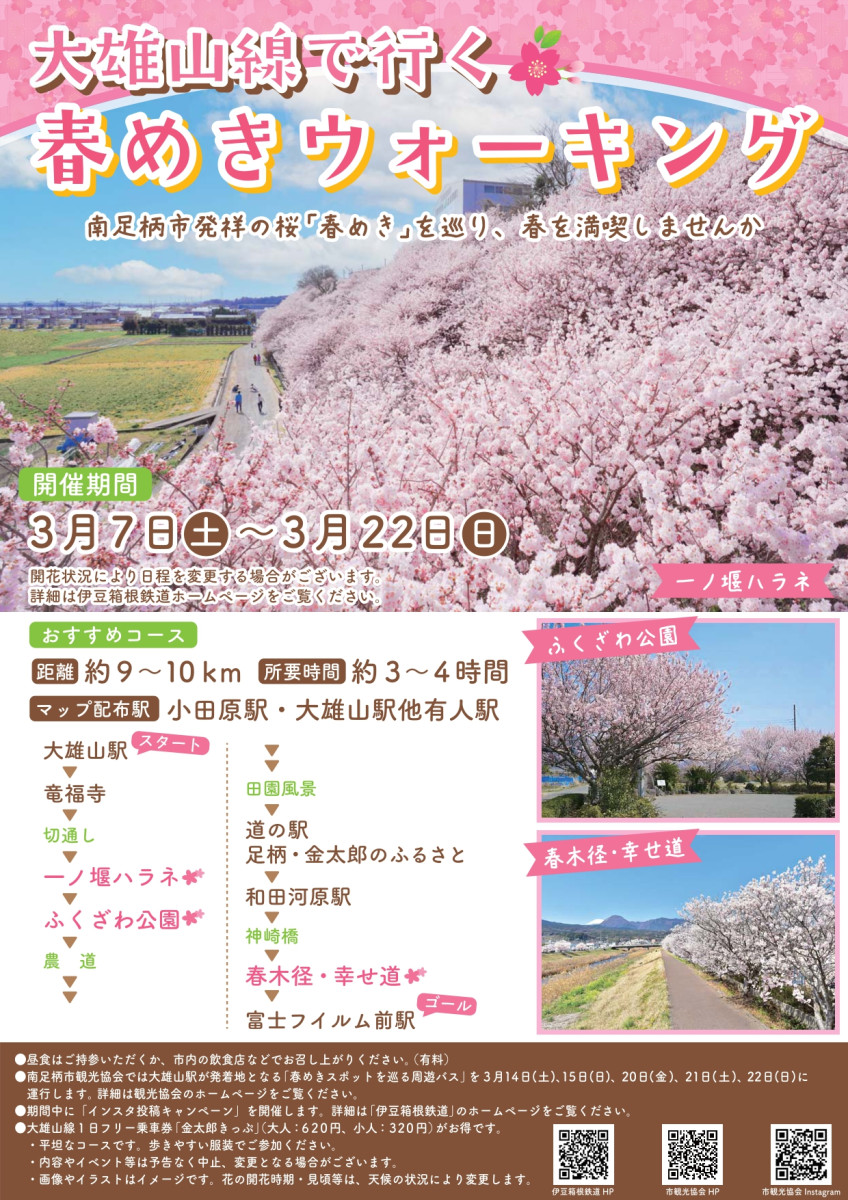 伊豆箱根鉄道では、2026年3月7日(土)から3月22日(日)まで、大雄山線・大雄山駅をスタート地点に、南足柄市発祥の桜「春めき」の名所を巡るウォーキングイベントを開催します。