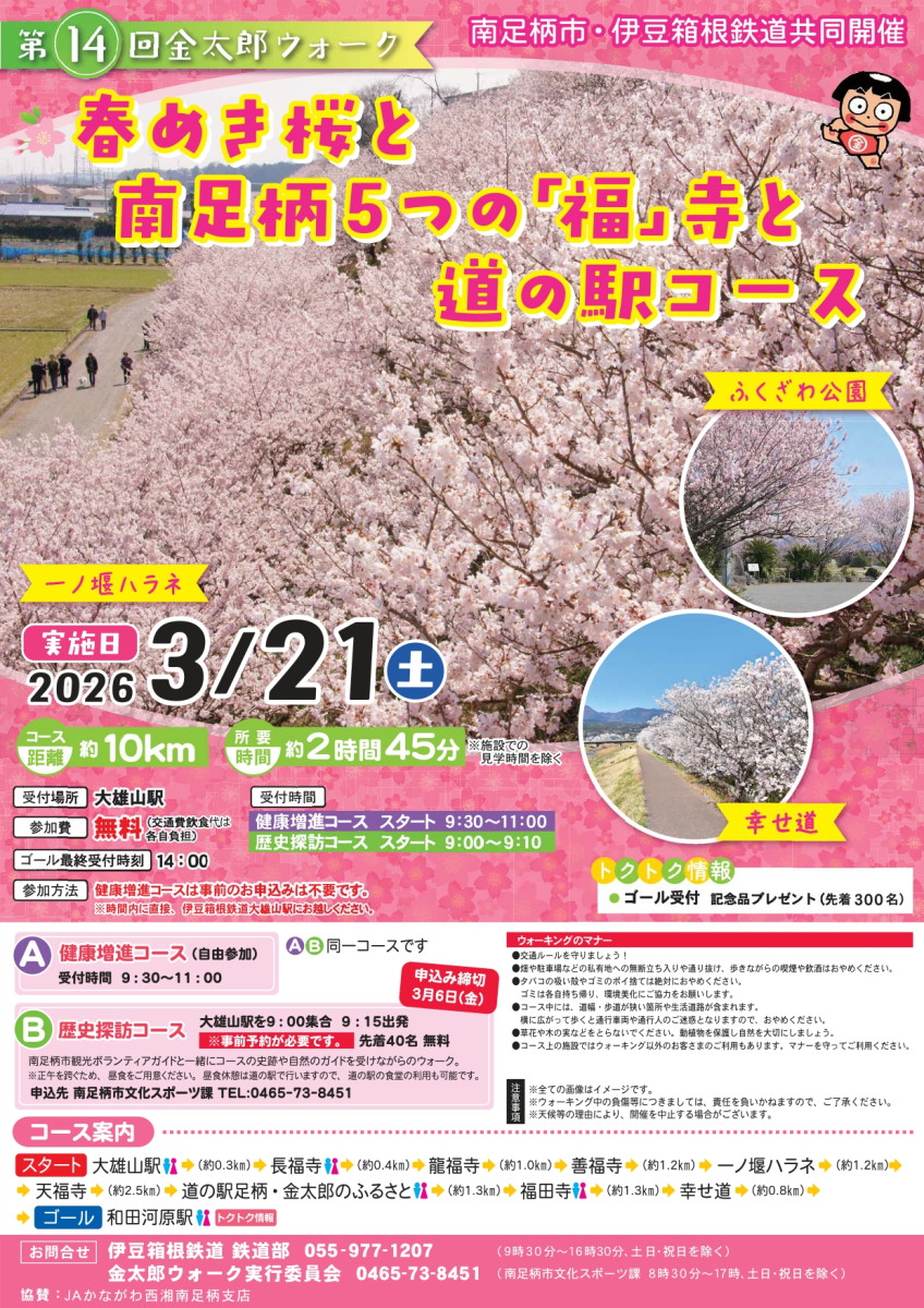 南足柄市と伊豆箱根鉄道は、3月21日(土)に、春めき桜の見頃に合わせて、市内の寺院や名所を巡るウォーキングイベント「春めき桜と南足柄『福』寺と道の駅コース」を開催します。