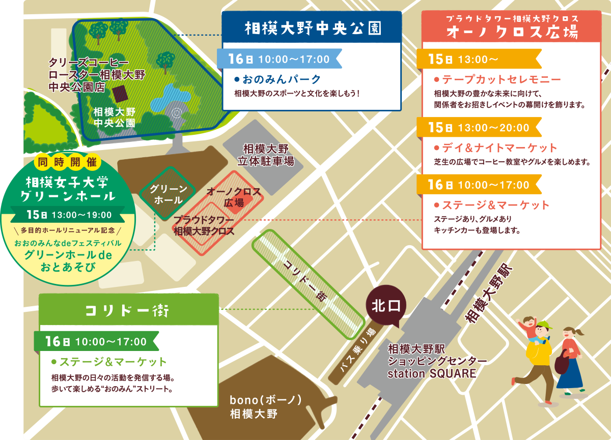 本イベントは、「相模大野のみんな=通称『おのみん』」が主役となり、まちの魅力と可能性を再発見する回遊型イベントです。プラウドタワー相模大野クロス オーノクロス広場・コリドー街・相模大野中央公園・相模女子大学グリーンホールとその周辺の相模大野駅周辺一帯を舞台に、人と活動がつながる特別な2日間を創出する回遊型イベントです。