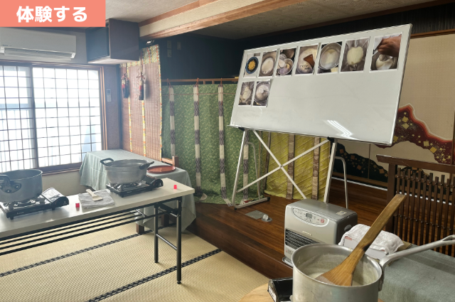 東学坊創業400年の歴史が息づく宿坊でできる大山豆腐作り体験。大豆の攪拌、煮る、搾る、おからと豆乳にわける、固めるといった豆腐作りの一連の流れを見学しながら作業を手伝います。ほかにも「浄書」と「写経」、宿泊明けの人は希望すれば神殿での朝拝にも参列できます。