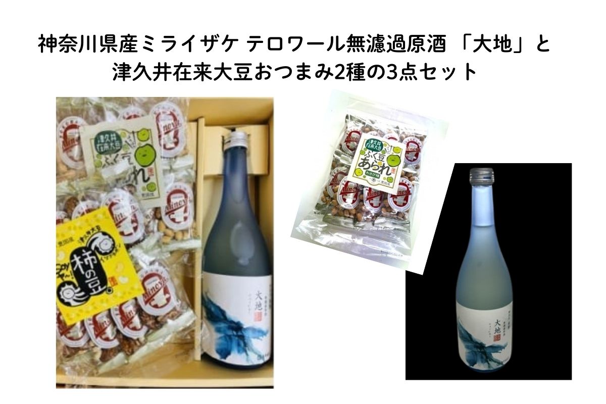 神奈川県唯一の盆地「秦野市」で栽培したお米五百万石を100%使用した日本酒「大地」と、豊国屋オリジナル商品である神奈川県産津久井在来大豆を使ったおつまみ2種の3点セットです。