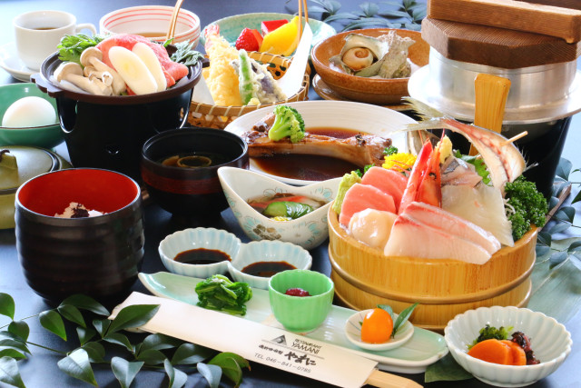 磯料理・旅館やまに観音崎のすぐ近く、走水海岸沿いに建つ、眺望と食事が評判の料理旅館です。客室の窓から望むのは、世界各国の船が行き交う浦賀水道。大型船が目の前を通る景色や、彼方に浮かぶ富士山を眺めながら、ゆったりとした時間を過ごせます。旅の醍醐味は、水揚げされたばかりの旬の魚介が並ぶ磯料理!速い潮流で身が締まり、脂が乗ったアジのお造りや、名物のサザエの壺焼きなど、海の恵みを存分に味わえます。宿泊はもちろん、ランチや日帰りでの食事利用も人気。都心から車で約1時間半、波音を聞きながら絶景と美食を楽しむ、心安らぐひとときをお過ごしください。