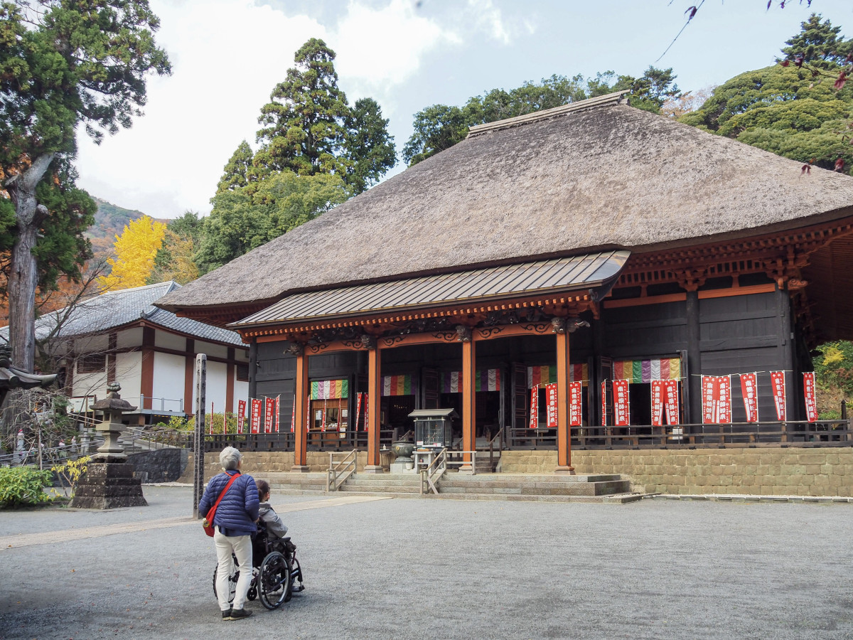 整った茅葺きの屋根が歴史を感じさせてくれる古刹で、いたるところから神秘さが感じられました。本堂へは木製のスロープを使って車いすで近づくことができ、車いすから立って常香炉にお線香を差し、煙を浴び、今度は車いすを降りて自分で段差を跨いで本堂内へ。薬師如来におまいりした後、また車いすから立って仏様を撫でて、運動量はこちらが一番! さすが健康祈願のお寺ですね、よいリハビリになりました。夫は視覚障がいがあり、薬師といえば⽬の仏様なので、しっかりお守りを授けていただき、よいお土産になりました。