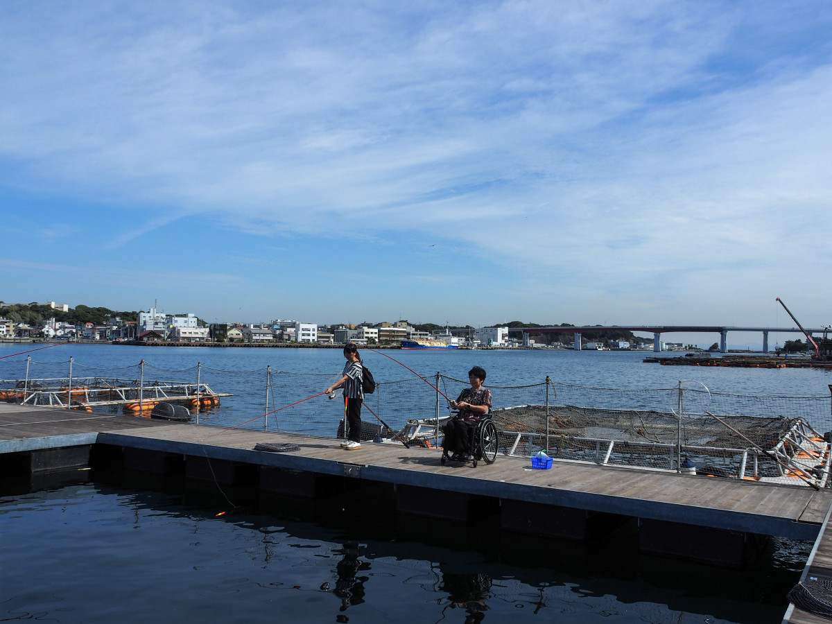 防波堤から歩いて行ける三崎港の海上釣り堀。段差もなくスロープで海上生け簀まで行くことができ、デッキもフラットで車いすでも安心でした。海の景色とにおい、空という自然の中で風もさわやかに感じられ、深呼吸できる非日常。釣りは車いすでは縁遠いと思い込んでいましたが、夢中になり、エサのつけ方や、うきのテクニックなど童心に帰ったようでした。いつもは子育てで多忙な娘と、久しぶりの親子水入らずの懐かしい思い出話ができたのもよかったですね。アクセスもよく、手ぶらで初心者にも楽しいユニバーサルな体験場所です。