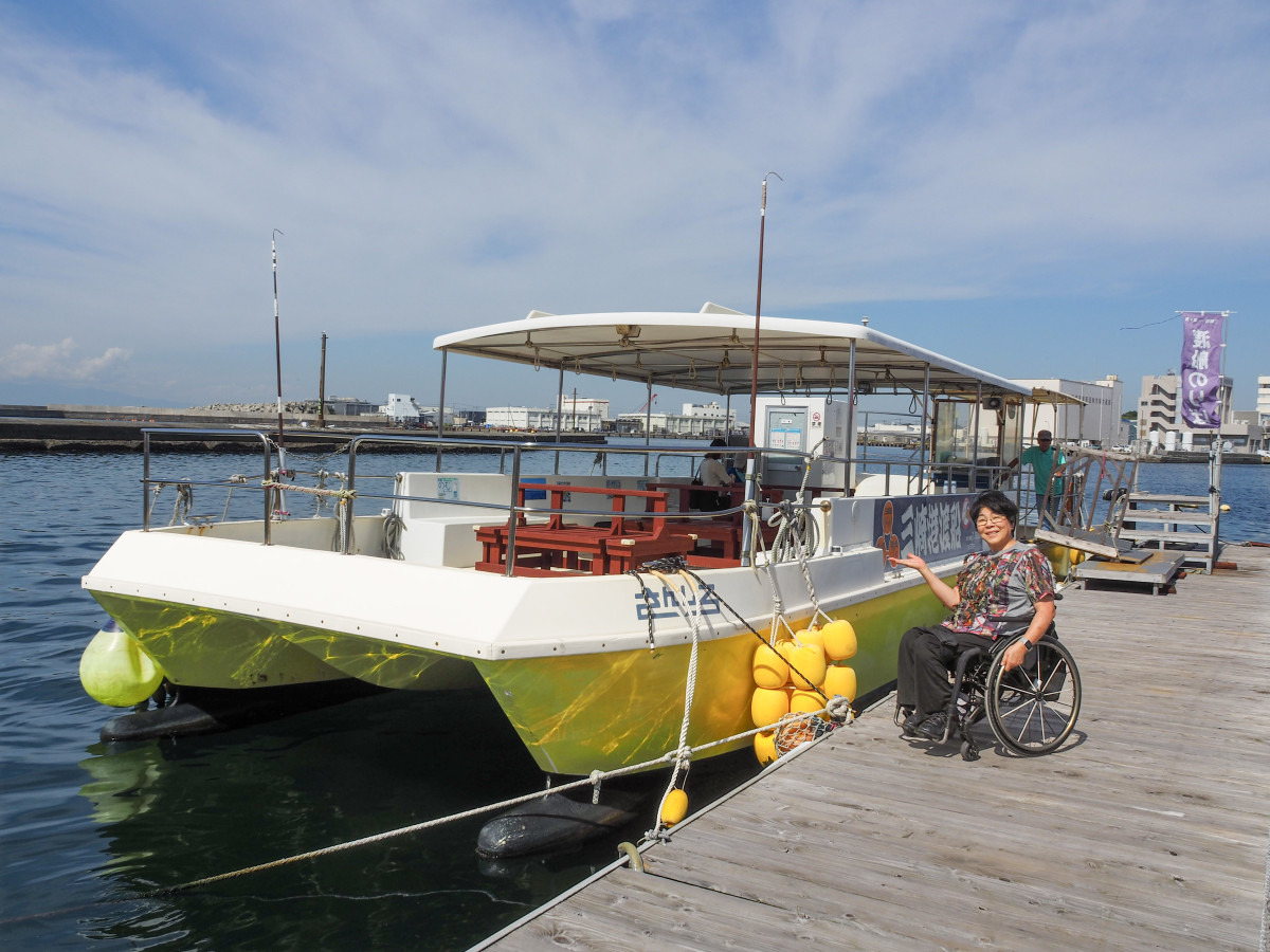 三崎港と城ヶ島を約5分で結ぶ渡船です。景色がよく、風を感じられて快適でした。小型船でも甲板はフラットで、船首もスペースが広くて車いすでも回転もできて動きやすかったです。また、船内のテーブルと椅子のセットが木製で可動でき、船員の方が車いすで通りやすいようにすぐ横に移動していただいて、不安もありませんでした。下船時はスロープで上がり桟橋にアクセスしやすかったのもいいですね。船員の方にスロープを慣れた様子でサポートしていただけました。ただ、電動車いすのタイプによってはスロープの傾斜がきついかもしれないので注意です。