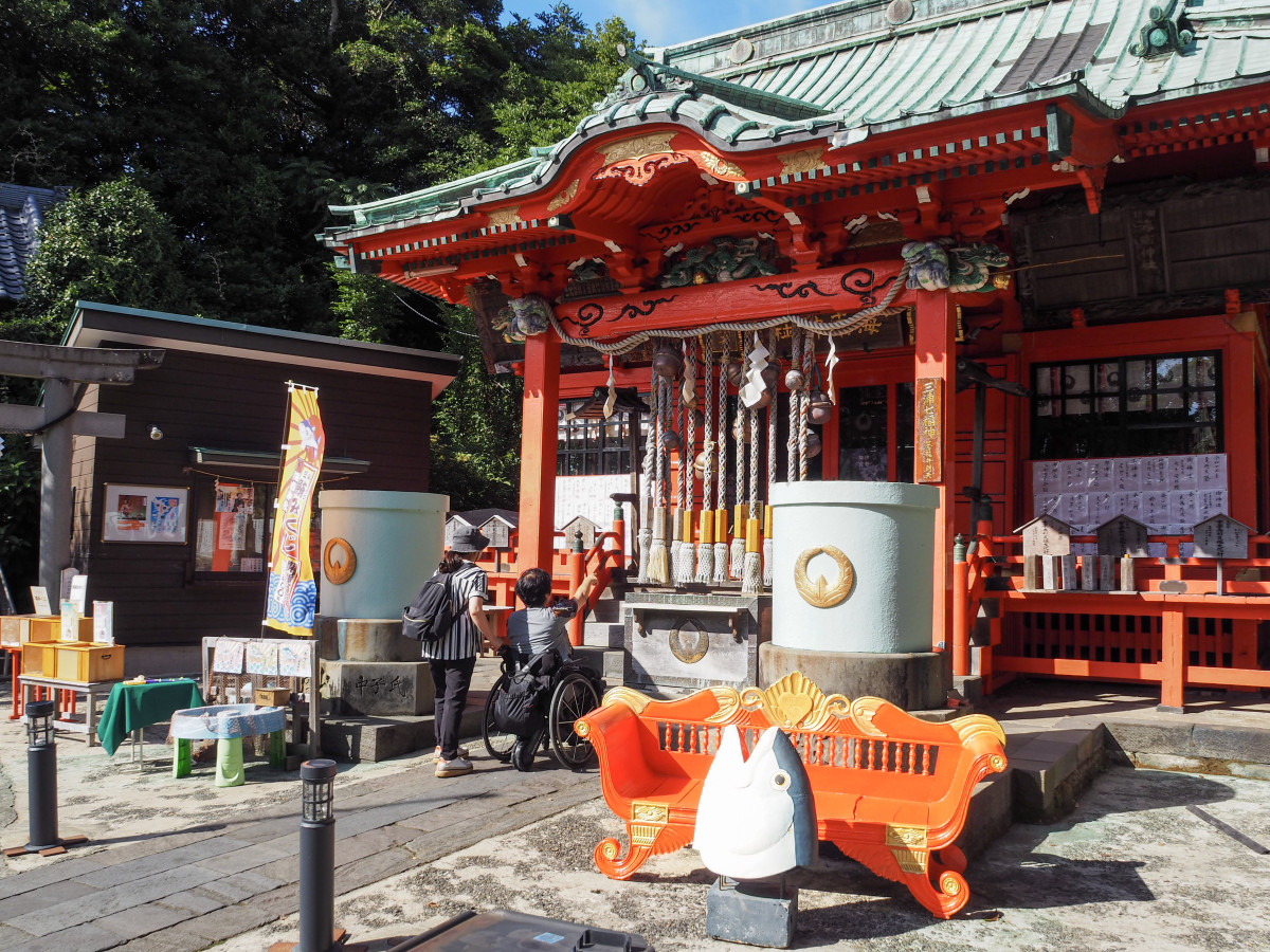 通路がコンクリートで、神社ではよく見られる土や石などの不整地がなく安心でした。当日は天気がよかったですが、これなら雨でも車いすでレインコートがあれば参拝できますね。境内には大きなイチョウの御神木があり、樹齢約800年で源頼朝が植えたと伝わるそう。ゆっくり見上げていましたが、歴史を感じる時間でした。スロープもあり本殿まで参拝できるのもよかったです。
