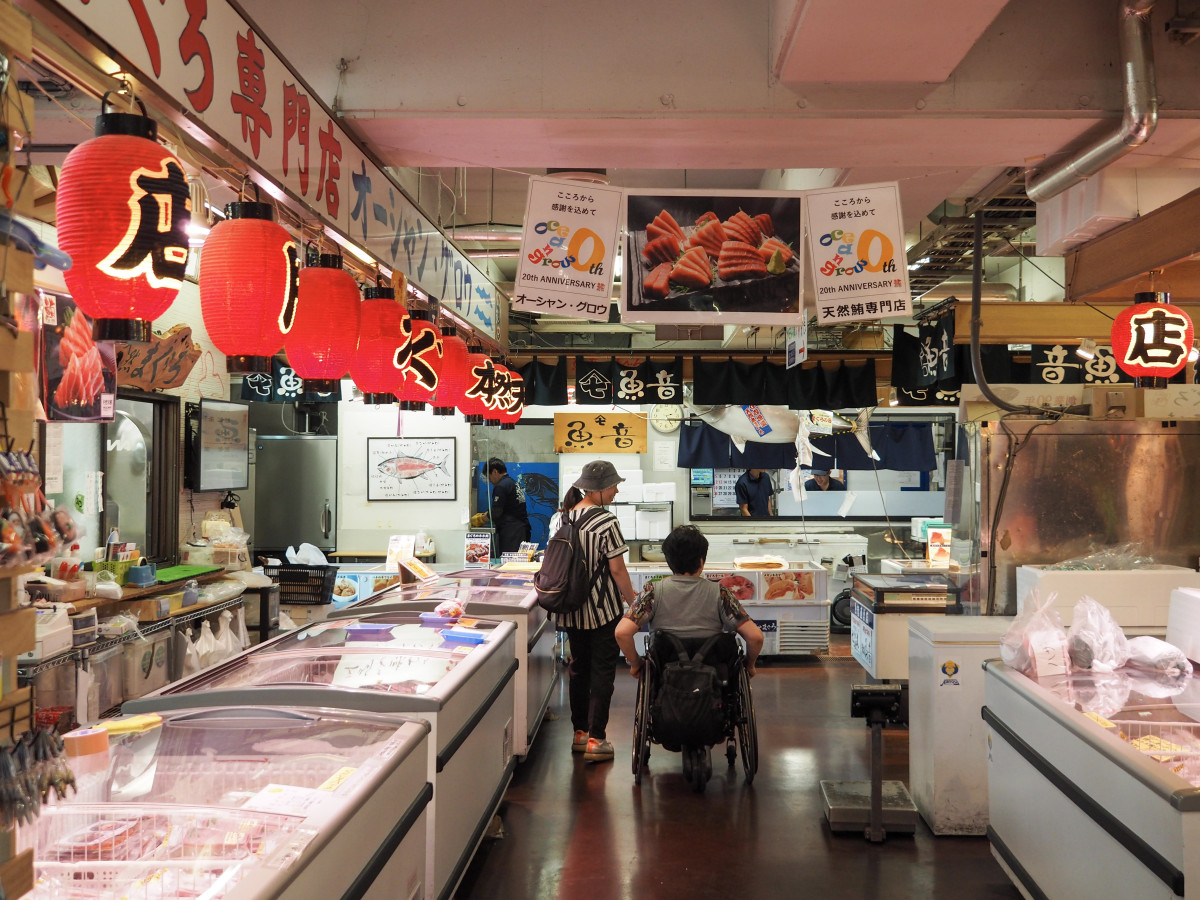 建物自体新しくはないですが、古くても広くて動きやすいですよ。エレベーターやトイレも車いすで利用でき、あとから時代的な流れで車いすマークを取り付けてもらっていたり、手作り感にむしろおもてなしを感じました。古いからできませんではなくて、古くても心遣いが大切ですよね。場内の「魚市場食堂」は、穴場のグルメスポット。いただいたメニューは、人気No.2の「市場の日替り地魚フライと刺身定食(2200円)」で、新鮮な魚をゆったり味わえ大満足です。