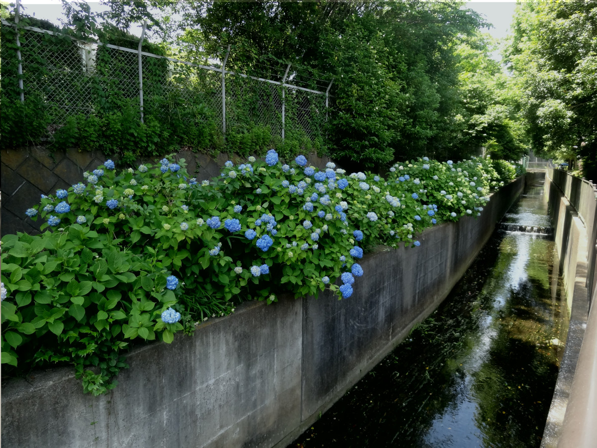 公園の西側を流れる大門川沿いのせせらぎ緑道に咲いている約60本のアジサイは、愛護会の方たちにより生育状況に合わせて剪定や肥料が施されており、和やかな気持ちになれる憩いの場となっています。