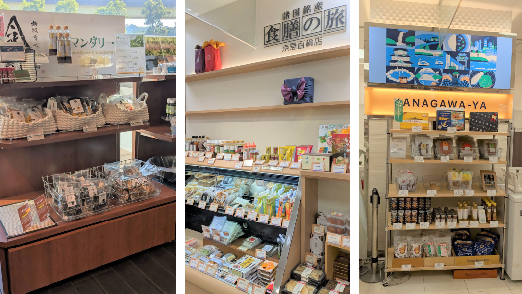 横浜あおみかんを使った商品は、(左)横浜テクノタワーホテル内の香港飲茶レストランCORE、(中)京急百貨店上大岡店地下食品売場食膳の旅コーナー、(右)そごう横浜店地下2階かながわ屋でお買い求めいただくことができます。