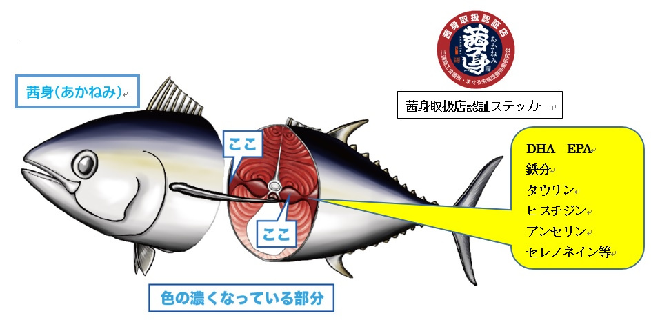 茜身(あかねみ)を知っていますか? 茜身とは、魚類に特有の筋肉であり、暗赤色に濃くなっている部位を指します。もともと血合肉などと呼ばれていますが、持久力を発揮する筋肉で、マグロやカジキ、カツオなどの回遊魚に多く存在しています。DHA、EPA、鉄分、タウリン、ヒスチジン、アンセリン、セレノネインなどが豊富に含まれていて、長時間運動を可能にする働きがあります。大腸がんの発生や血圧上昇の抑制効果、生活習慣病の要因となる活性酸素を取り除く効果、メラニン合成抑制作用があることが神奈川県水産技術センター、水産技術研究所、聖マリアンナ医科大学の共同研究により実証されました。 三浦市では、2024年に血合肉に替わる名称を募集し、応募総数2,583件の中から「茜身(あかねみ)」が選ばれました。