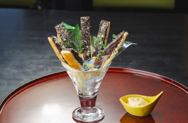 メバチマグロの茜身の真薯を食パンに塗り、素揚げしたものをカットしています。ディップをつけて召し上がれ。