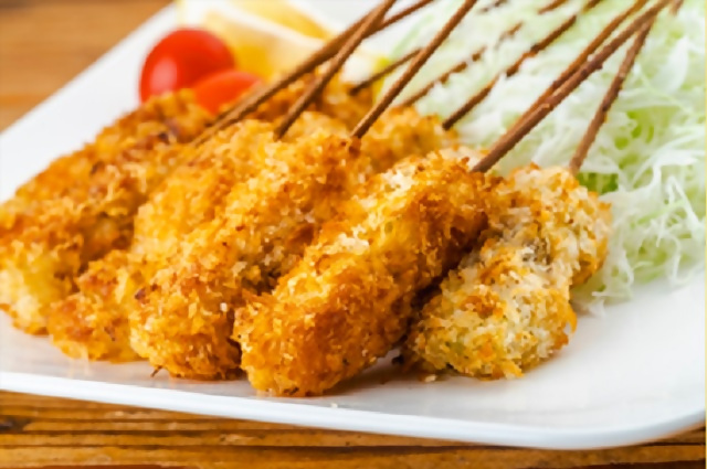 カジキ茜身と玉ねぎに塩コショウをふり、小麦粉・卵・パン粉につけて焼き上げています。あっさりとポン酢で食べるのがおすすめです。