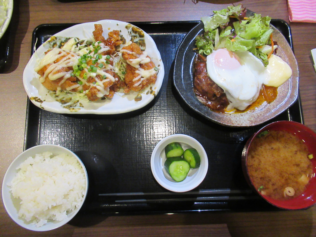 七味を効かせた甘醤油にどっぷり漬けてカラットと揚げた鶏肉にマヨネーズをかけて熱々のうちにどうぞ(写真左上・右上は手作りハンバーグ)