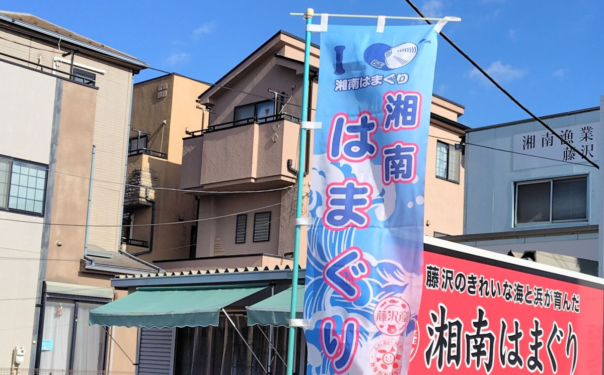 ハマグリ直売所と料理は『湘南はまぐり』の幟が目印
