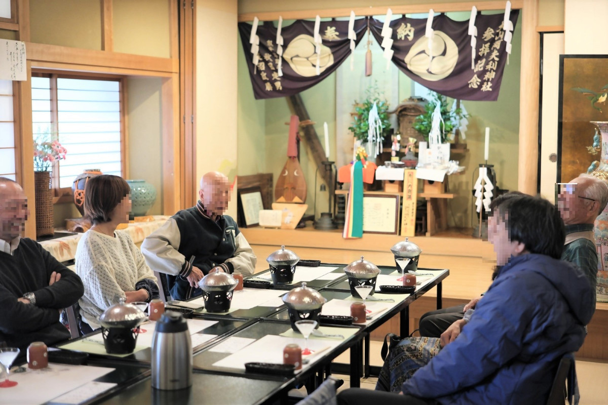 さて、次に訪れたのは、今年のジビエフェアに初参加した門前町の「蓬生亭 逸見(よもぎてい へんみ)」です。清流・鈴川のほとりに静かに佇む、歴史ある宿坊でジビエランチセットをいただきました。 案内されたのは、宿坊ならではの祭壇が設えられた特別な部屋。最初に運ばれてきたのは、香り豊かな柚子の食前酒。まずは乾杯。さっぱりとした味わいが食欲をそそります。