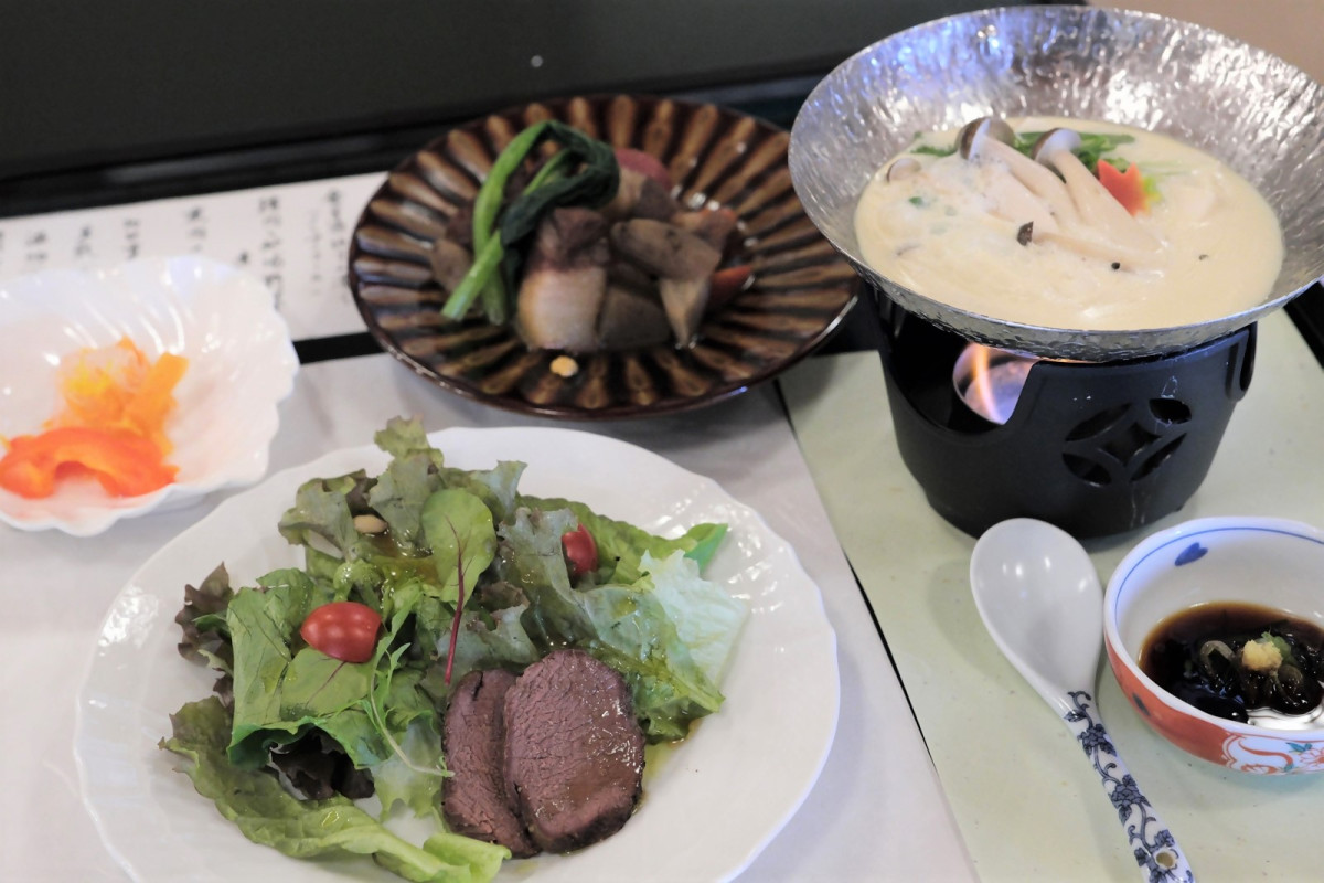 こちらのジビエランチセットは、鹿と猪という二つの山の恵みを一度に味わえるのが特徴です。 まずは、鹿肉のロースト。しっとりと柔らかく、クセのない上品な味わいで、添えられた新鮮野菜のサラダとともに、さっぱりといただけます。一方、猪肉といえば「ぼたん鍋」の印象が強いかもしれませんが、こちらではさつまいも、ごぼう、にんじんなどの地野菜とともにじっくり煮込まれて登場します。脂身までしっかりと味がしみ込み、もちもちとした古代米のご飯との相性も抜群。山の滋味を存分に感じられる一品です。 そして嬉しいのが、土日限定で提供される大山名物・豆腐の一品。きのこと豆乳のやさしい味わい、そして目の前でぐつぐつと沸き立つ小鍋に、心も身体もほっと温まりました。