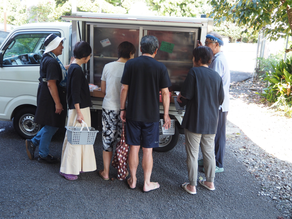 「みなと食堂」と大書した冷房車ミニバンが、朝とれの魚、海産物を載せて走ります。市街地から離れた住民にとって、新鮮な魚が手に入る「ありがたいサービスです」。車はミカン畑の山道をたどり土・日を除いた午前8時から、20か所ほどを回ります。住宅団地や山あいに車が止まると人々が集まります。付近には住民の元気な声がこだまします。