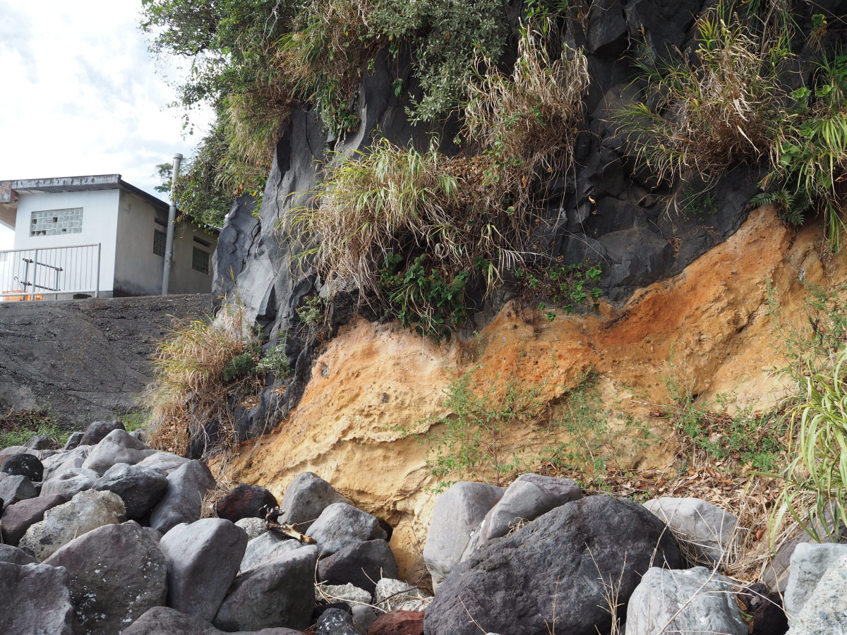 食堂から見える伊豆半島はその昔、南方海底の一塊の火山列でした。地球のプレートの動きで約800㌔㍍の道のりを長い年月をかけて移動し、100万年前に本州に衝突しました。『日本列島で最後に加わった陸地』です。 港に隣接して「かつらご海岸」(写真)があります。地層断面を見ると火山灰や岩が風化した赤土の上に、後代の箱根火山の溶岩(黒色)が流れて重なり、そのまま真鶴半島を形成したことが分かります。約15万年前の出来事です。学術的には大変貴重な場所です。