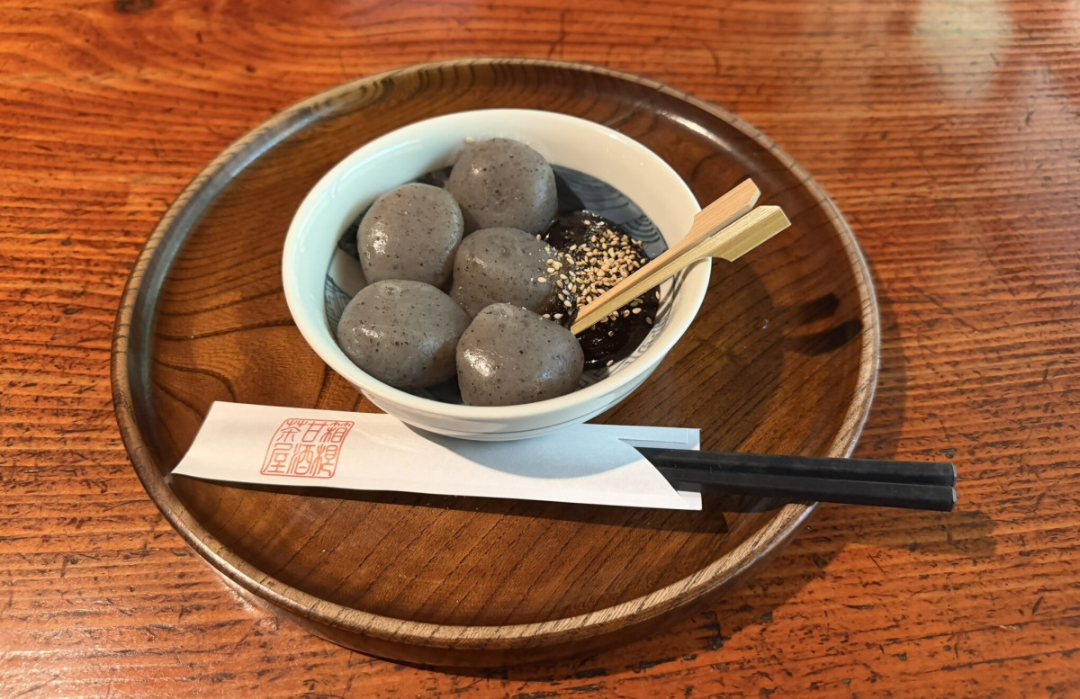 毎日早朝から搗いたお餅を備長炭で焼いています。味は、新潟、福島産 の青大豆を碾いたうぐいすきな粉、海苔巻き、その日の朝に擂った黒ごま(数量限定)の3種類です。旧街道を上り下りしてきた旅人の小腹を満たしてくれます。