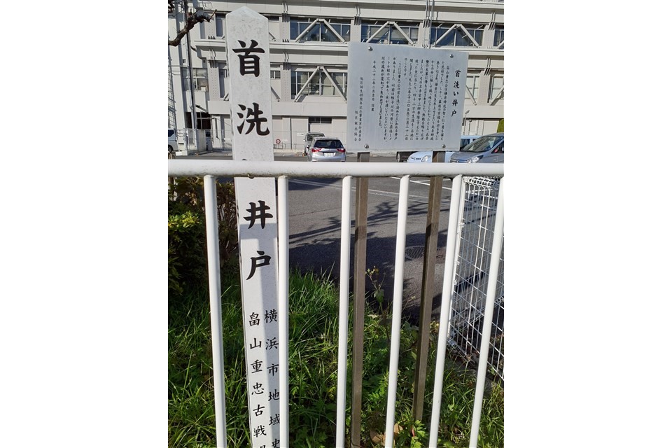 「首塚」の斜め前、区役所の駐車場のところに、「首洗い井戸」の標柱が立っています。重忠の首を洗い清めたと言われる帷子川の河原にあった井戸は、現在はなくなり、標柱のみとなっています。蛇行の激しい暴れ川だったため、直線化するなどの改修が行われ、川は遠のいて失われてしまいましたが、以前の河原には直径1メートル程の穴があり、水が湧いていたと言われています。首洗い井戸の標柱