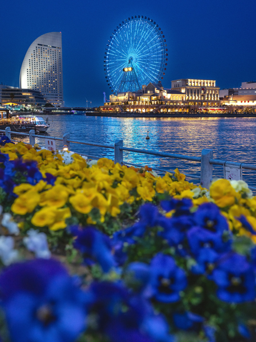 夜景かつパンジーの構図が美しい驚きの景色です。観覧車のライトの色、パンジーと空の色が青で統一されているのも被写体がたくさんある中で見事まとまっている理由ですね。横浜のきらめきと花の可憐さが共存し、間違いなく「自慢したい横浜」の景色ですね。