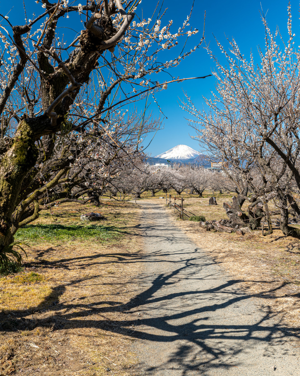 いい香りがしそうな梅林の道がすーっと奥へ続き、その先に富士山が待っている構図がとても気持ちいい一枚です。梅のやさしい色の中で、手前に落ちる枝の影がぐっと力強さを生み、作品に奥深さが生まれています。大きくポスターのように印刷して飾りたくなる作品です。