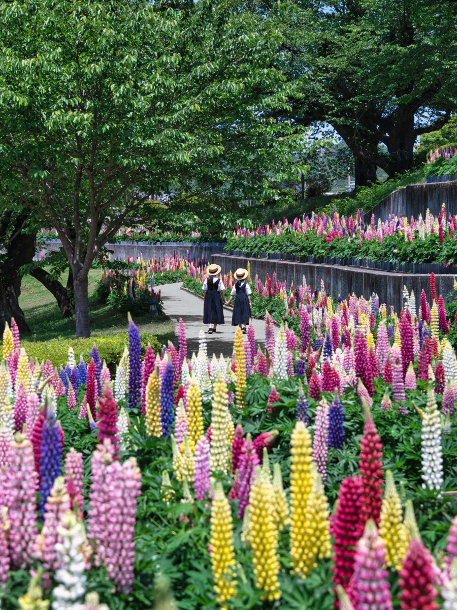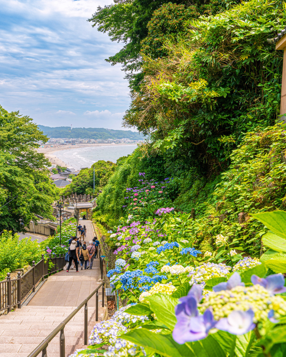 紫陽花が続く階段から、奥の海へ視線が抜ける構図が気持ちいい一枚。人がいることでスケール感が伝わり、私も行ってみたくなりました!湘南エリアらしい初夏の光と紫陽花と緑のボリュームが「かながわの花絶景」をしっかりアピールできる作品です。
