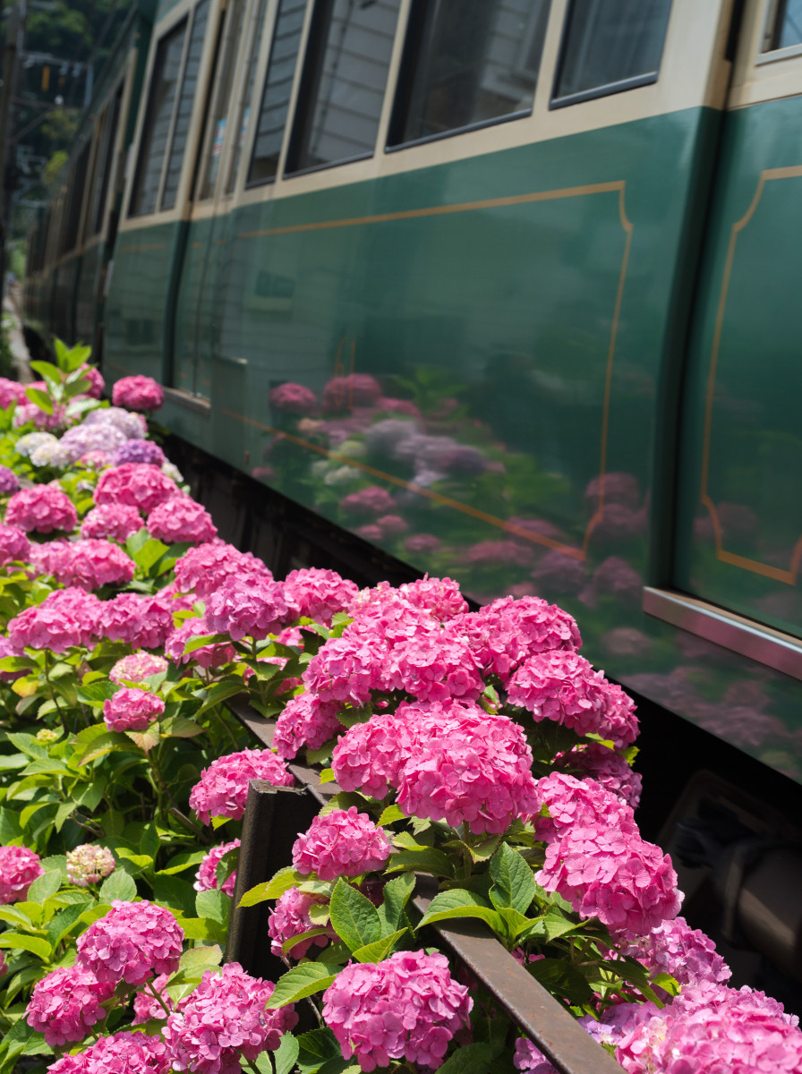 一目みて印象的な写真でした!紫陽花を、江ノ電の車体のラインに反射しているのがまた美しい。なかなか反射の具合や電車の位置など難しかったのではと思いますが、秀逸な構図と着眼点で素敵です。