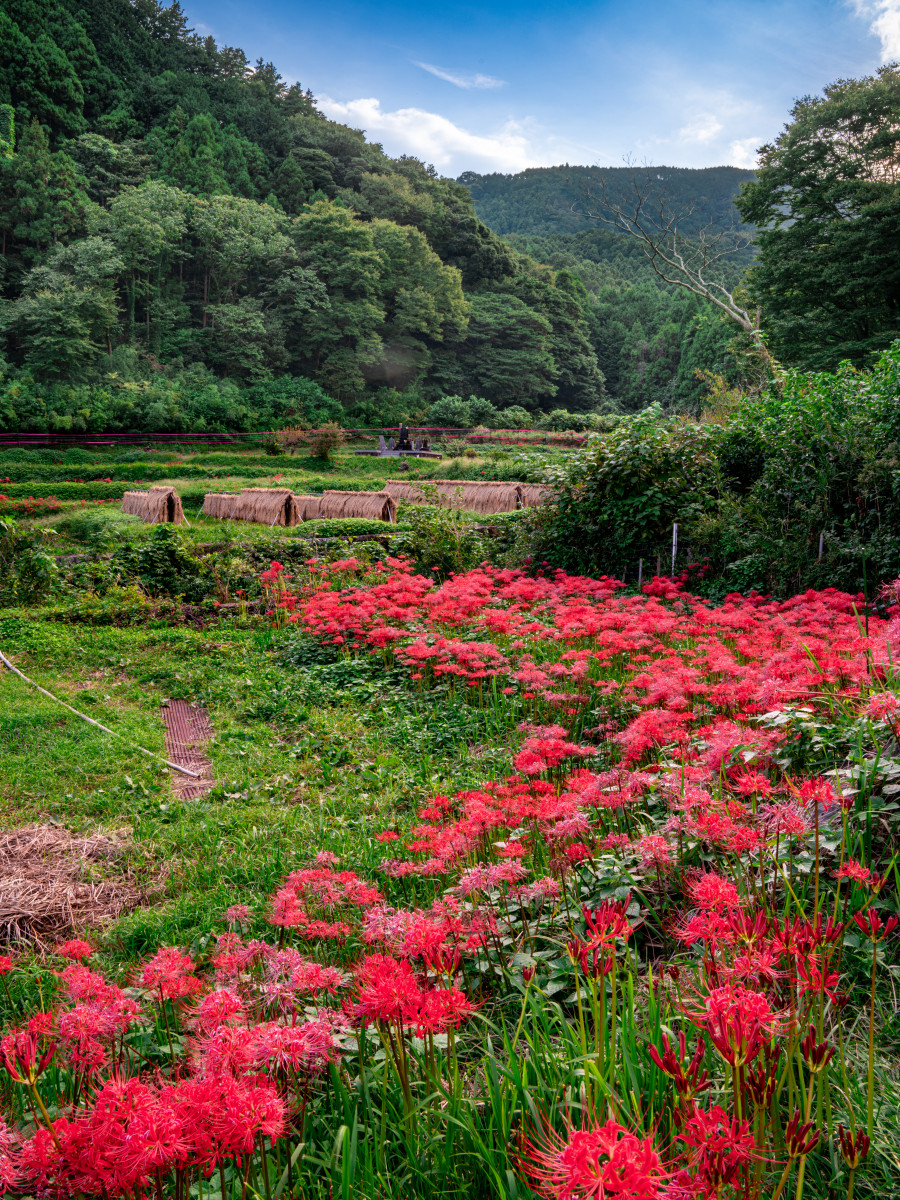 彼岸花の山里の日本の伝統的な風景。手前から山へ段々と続くように咲く彼岸花の赤が、木々の緑と対比して印象的です。さらに奥には収穫した稲を天日干しさせている風景でしょうか。秋の深まりを感じさせる見事な一枚です。