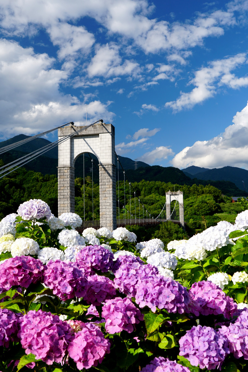 手前の紫陽花から橋と青空。風の吊り橋の重厚感と紫陽花や雲のやさしさの対比が美しいです。この公園の四季を表すうちの一枚絵になりそうな力強い写真で、他の季節の花との組み合わせも見たくなりました。