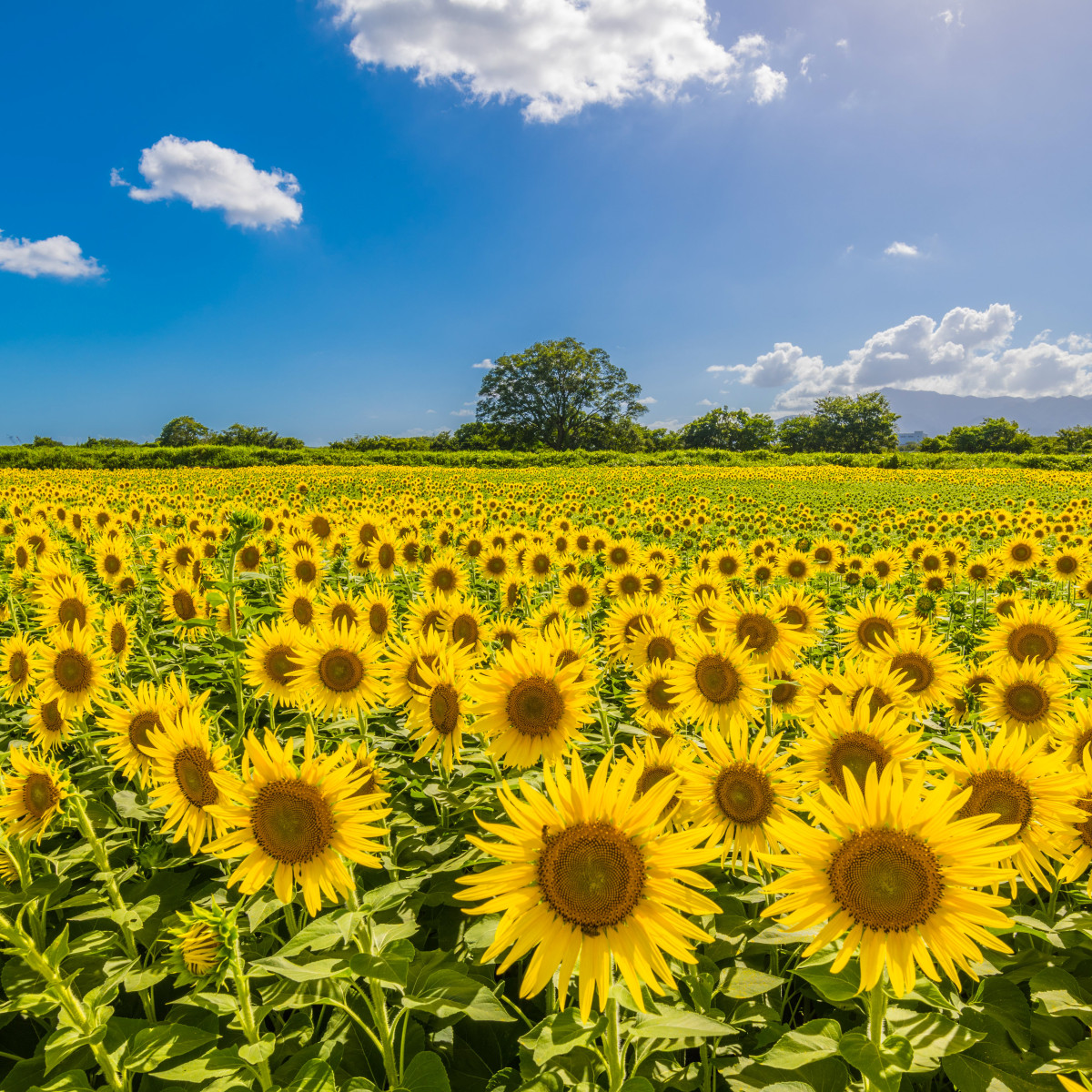 座間ひまわり畑のひまわりがたちが初夏の訪れを喜んでいるようで、心躍る気持ちになる一枚です。手前から奥へグッと広がる花の波が気持ちよく、初夏の空気がふわっと届きます。奥の真ん中に立つ一本の木が、広い景色をきゅっとまとめてくれていて、心地よさがあります。
