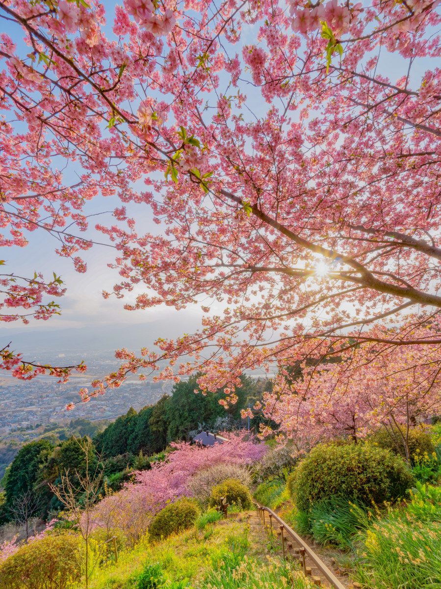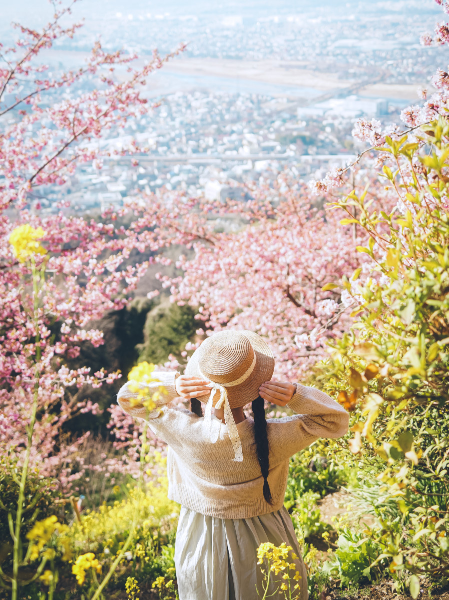 高台から見下ろす街並みと河津桜と菜の花のフレーム、さらに女の子が見晴らす後ろ姿で没入感があります。あえて空までは入れずに街並みで埋めているのが思い切りがあって好きです。春一色の景色で、春の陽射しを浴びにお出かけしに行きたくなりました。