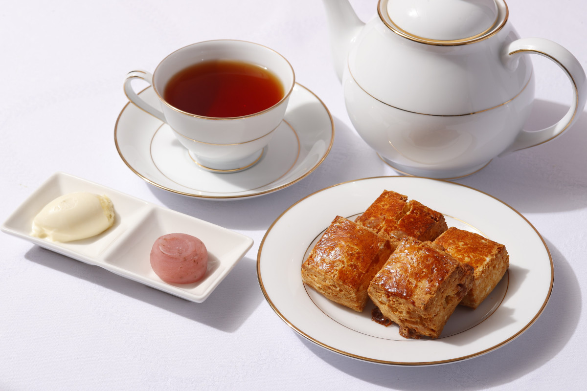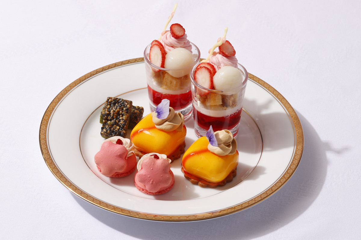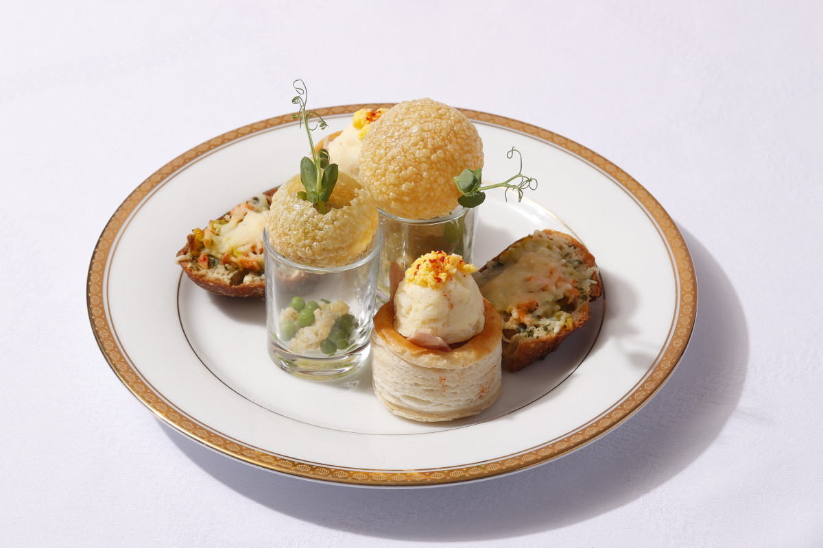 和と洋の素材を絶妙にミックスした季節感あふれるメニューで、横浜に訪れる「春」を表現。旬の苺に桜のゼリーやクリームを重ね、白玉を添えたグラスパフェや、ほろ苦い緑茶に胡麻の風味を合わせたフロランタン、生姜風味がアクセントのオレンジムースなど、パティシエのアイデアと技が光るスイーツが彩り豊かに揃います。セイボリーには、磯の香りただようあおさと桜エビのタルティーヌや、インドで広く親しまれているローカルフードのパニプリ、軽い食感の丸いパイの上にポテトサラダをトッピングした一品など、旬の素材を多彩なアレンジでお届けします。「春」を愛でる和洋折衷な味わいを楽しむ優雅なティータイムをお楽しみ下さい。
