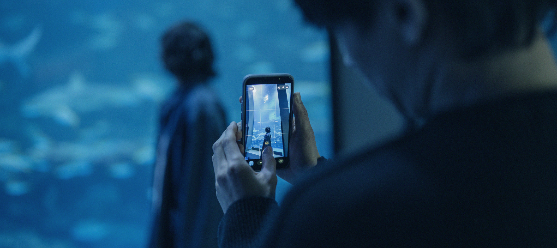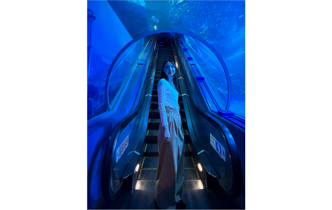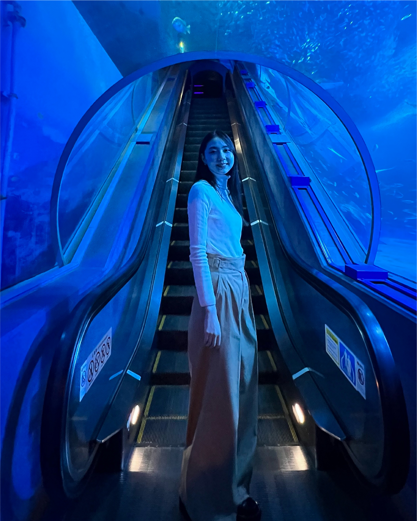 アクアミュージアム内にある人気スポット、アクアチューブ。頭上を180度覆うチューブ型の水槽を通るエスカレーターだ。ここでの撮影では、シンメトリー構図を活用して撮影してみよう。