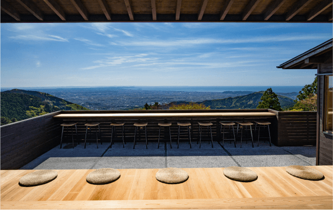 大山阿夫利神社下社にある茶寮。相模湾が目の前に広がるテラス席や趣のある店内からは、天気がよければ房総半島や伊豆大島まで見渡せる。名物のコーヒーは、長命延寿の水として愛され続けてきた、大山阿夫利神社の御神水で淹れている。豊富なミネラルと、甘さが特長の御神水は、汲んでいく人も多いのだとか。