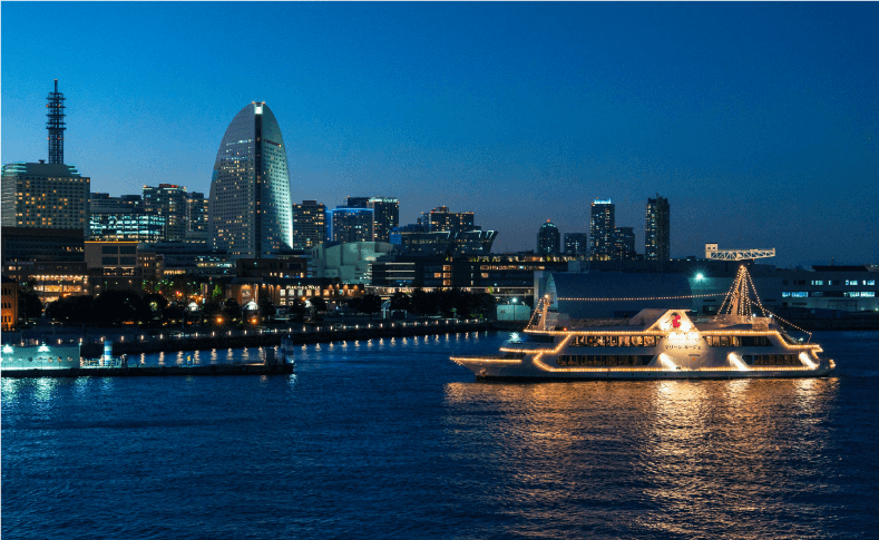 横浜港を出航し、夜景に包まれる海上を進むディナークルーズ船は、赤レンガ倉庫を19時30分に出航。みなとみらいやベイブリッジを望みながら、フレンチのコース料理を楽しめる。時間とともに表情を変える景色が、食事の余韻をより深いものに。