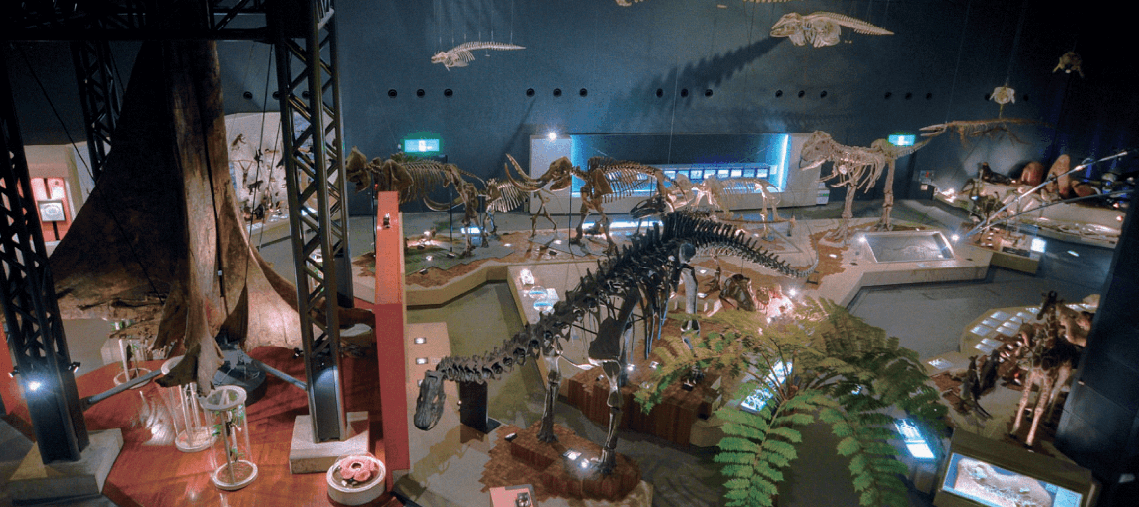 神奈川県立生命の星・地球博物館は、46億年の地球の歴史と生命の多様性を展示した自然系博物館です。恐竜の骨格や隕石など1万点以上の実物標本で学ぶことができ、ティラノサウルスの巨大な化石から昆虫まで、迫力ある展示が特徴で、子供から大人まで一日中楽しめる家族連れに人気のスポットです。 エントランスを抜けると、天井の壮大な宇宙波の絵や、恐竜の骨格標本が出迎えてくれて、 地球誕生の神秘的な世界へ探検できます。