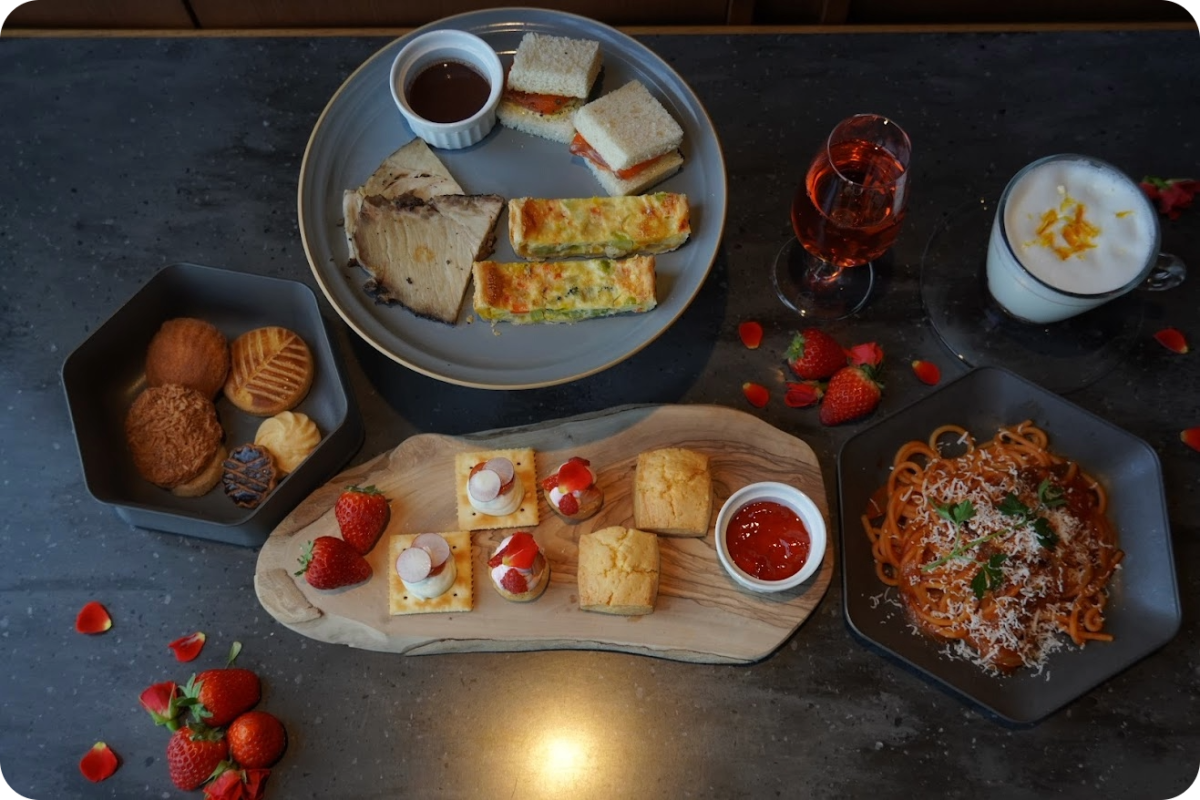 THE YOKOHAMA FRONT最上階に 位置する 「sky lounge cafe&bar mequ」から、横浜駅⼀の景⾊とともに、ハイティーをご提供。また、焼き菓⼦やカフェは神奈川県内のお店の物をセレクト。東京〜横浜の景⾊を⼀望しながら、季節のお⾷事と神奈川県のお品をお楽しみください。
