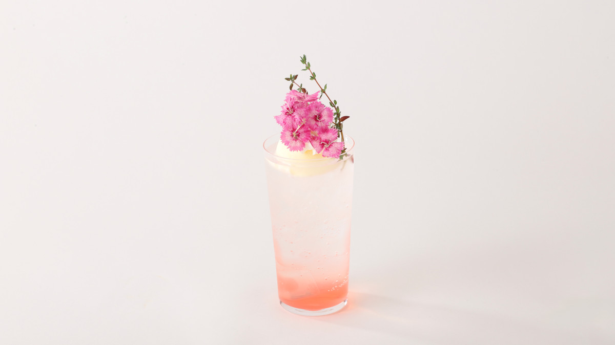 3階ワンダリアカフェの季節限定メニュー「春の桜クリームソーダ」。そのクリームソーダに添えられたエディブルフラワーを贅沢に増量した特別仕様でご提供します。