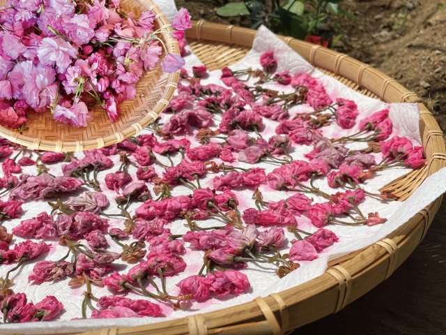 足柄上郡大井町にて生産される「桜花漬け」。華やかなピンク色の花を摘み取り、桜の塩漬けを作る体験ができます。 -