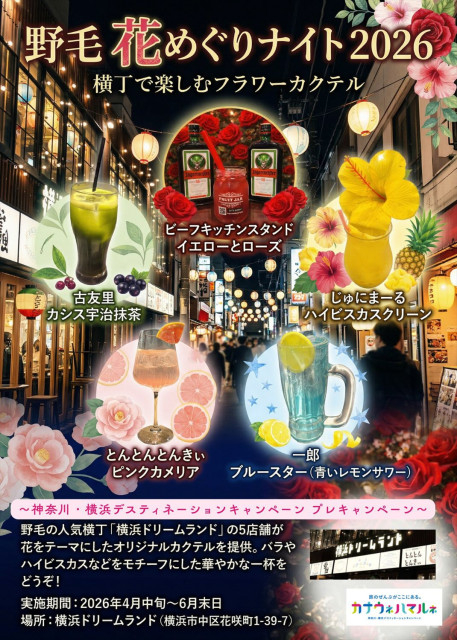 野毛 花めぐりナイト 2026 ― 横丁で楽しむフラワーカクテル横浜・野毛の人気飲み屋街「野毛ドリームランド横丁」で、5店舗が花をテーマにしたオリジナルカクテルを提供。バラやハイビスカスなどをモチーフにした華やかな一杯を、気軽に飲み歩きで楽しめます。 -