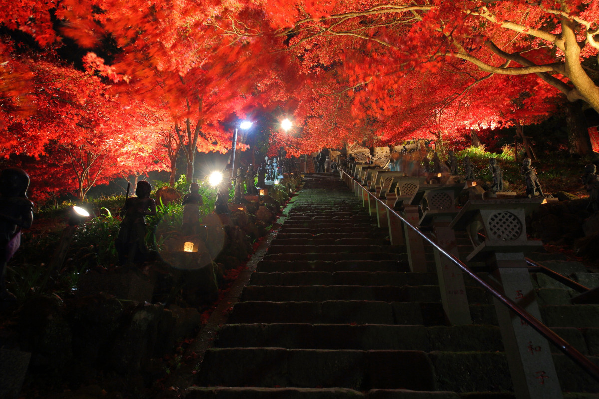 11月には門前の紅葉が色づき、ライトアップも行われ、昼間とは異なる雰囲気を楽しむことができます。