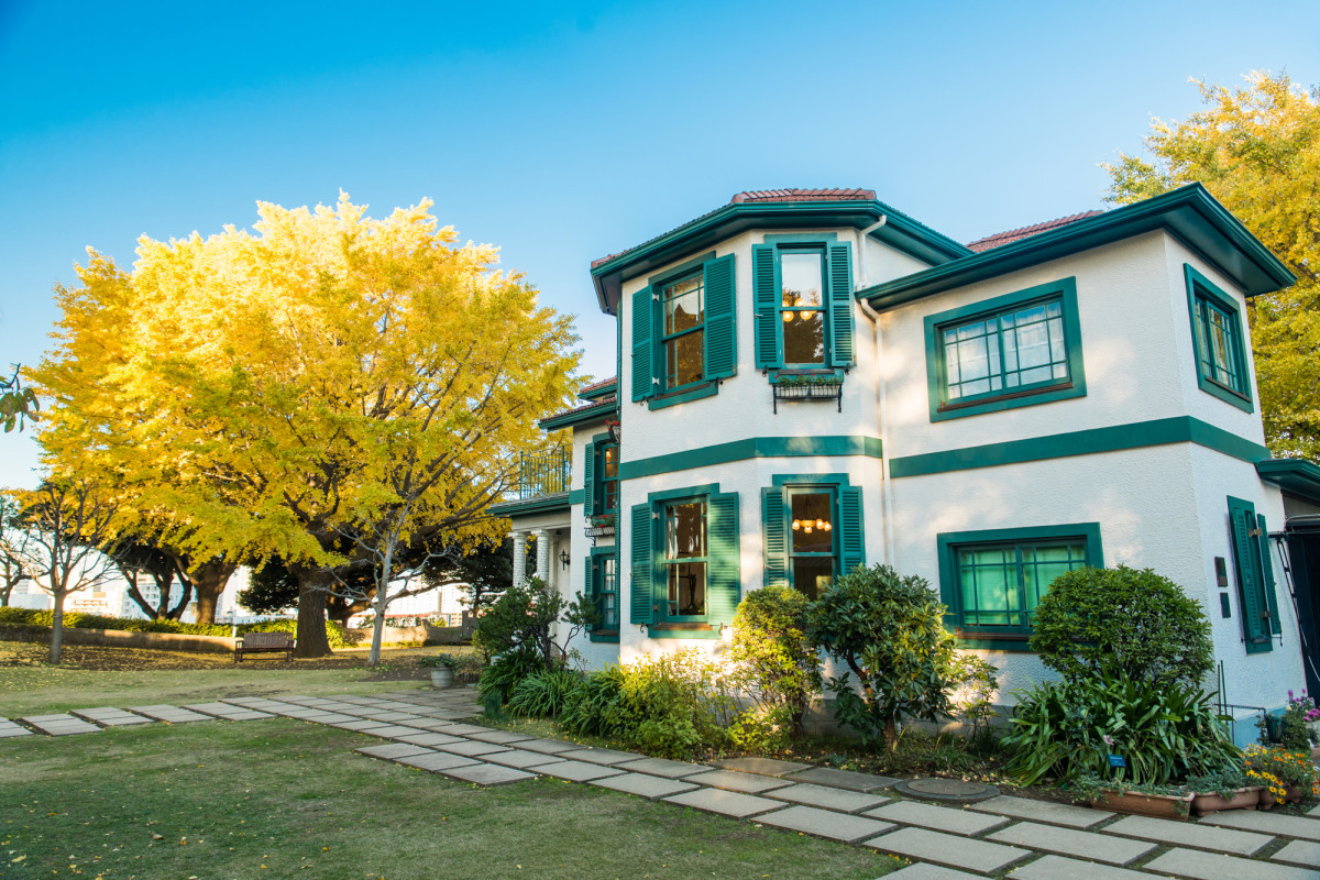 ブラフ18番館は、関東大震災(1923年)後に山手町45番地に建てられた外国人住宅で、戦後はカトリック山手教会の司祭館として平成3年まで使用されてきました。その後、山手イタリア山庭園の一郭に移築復元され、平成5年から一般公開されるようになりました。木造2階建ての建物は、フランス瓦の屋根、暖炉の煙突、ベイウィンドウ、上げ下げ窓と鎧戸、南側のバルコニーなど、震災前の外国人住宅の特徴を色濃く残しており、館内は当時の横浜家具を復元展示して大正末期から昭和初期の外国人住宅の暮らしを再現しています。また、解体時の調査により、これは震災前に建てられた建物が火災を免れ、山手町45番地のR.Cバウデン氏が部材を転用して同じ場所に再建したものであることが判明しました。