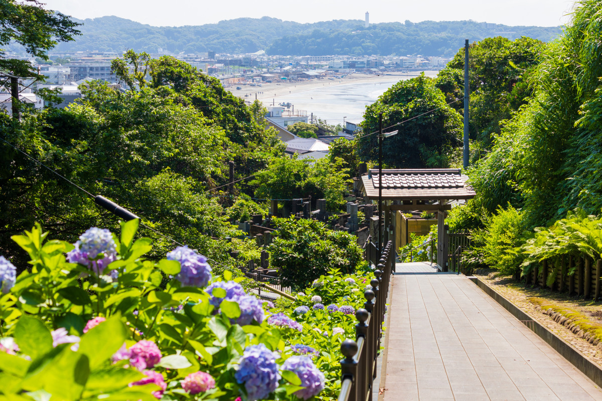 護摩修法が行われていたこの地に、三代執権北条泰時が1219年に建立しました。1333年新田義貞の鎌倉攻めで焼失し西ヶ谷に移りましたが、1688年に中興の祖・祐尊により元の地に再建されました。108段の階段を上った山上にあり、由比ヶ浜を一望する眺めは絶景。かつては鎌倉を守る要所であったことが偲ばれます。以前参道を彩っていたアジサイ200株は宮城県南三陸町に寄贈。現在は、50株ほどのアジサイが6月中旬頃に参道を彩ります。また、宮城県とのご縁で植えられた30株ほどの萩が9月に見頃を迎えます。境内では3月下旬に桜、6月上旬にはナツツバキが、7月中旬には大賀バスが花を咲かせます。