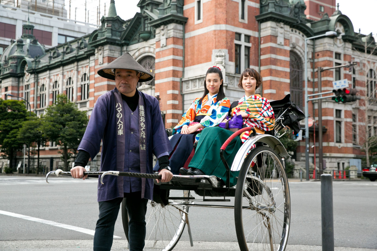 袴を着てハイカラ着物体験ができます。ブーツに袴の活動的なスタイルが散策にも適しています。