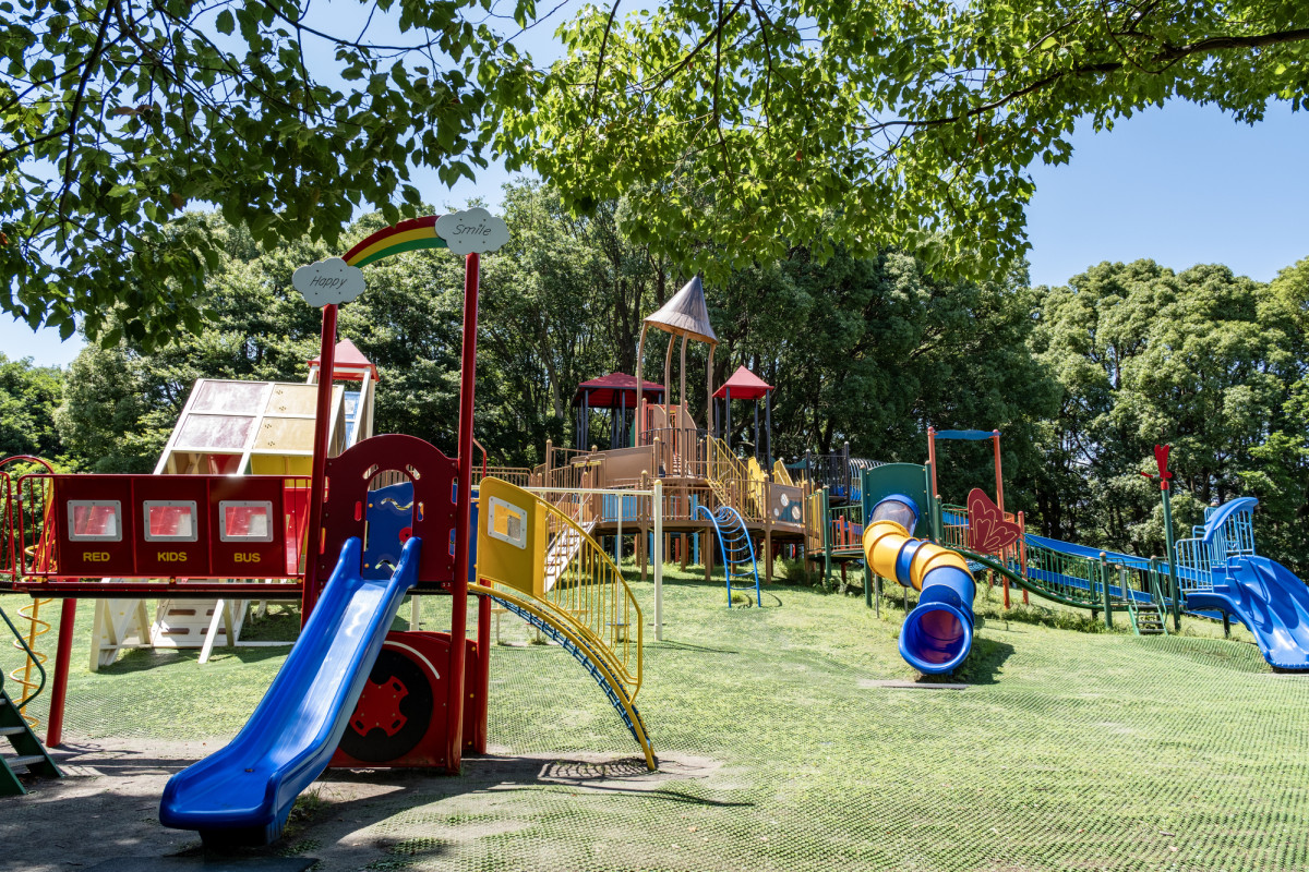 園内には、平塚のはらっぱや複合遊具のあるわんぱく広場など子供が楽しめるエリアもたくさん!「ふれあい動物園」では、ヤギやヒツジとのふれあい体験をはじめ、ポニー乗馬体験も人気です。夏期は「流れの広場」で水遊びもおすすめ。