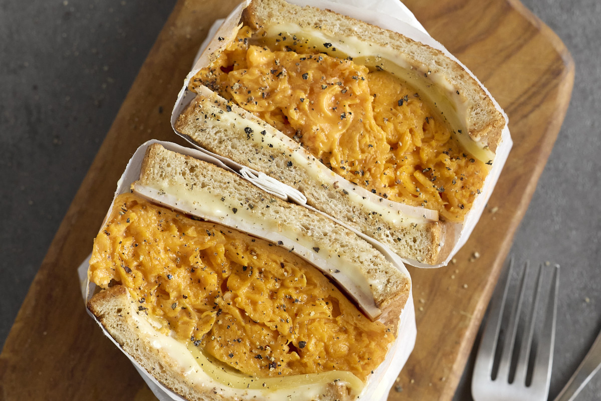 看板メニューは、厳選した卵を贅沢に使い、オーダーごとに丁寧に焼き上げるオムレツサンド。全粒粉のパンに挟まれ手に持てないほどの厚みがありながら、口の中でふわりとほどける驚きの食感です。さらに、「ハム&チーズ」などのトッピングが、濃厚な旨みを引き立てます。