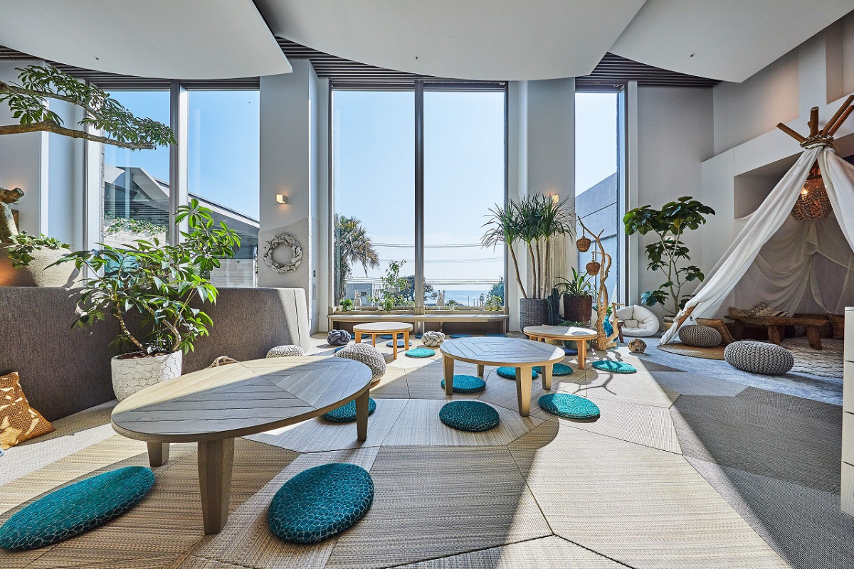 森戸海岸の近くに建つ、海とアートをテーマにしたおしゃれなリゾートホテル。館内に入るとまず目を引くのが、吹き抜けの開放的なカフェ&バー「SANDBAR」。流木や石を使ったアートが飾られ、宿泊客だけでなく地元の人々も集う交流の場となっています。