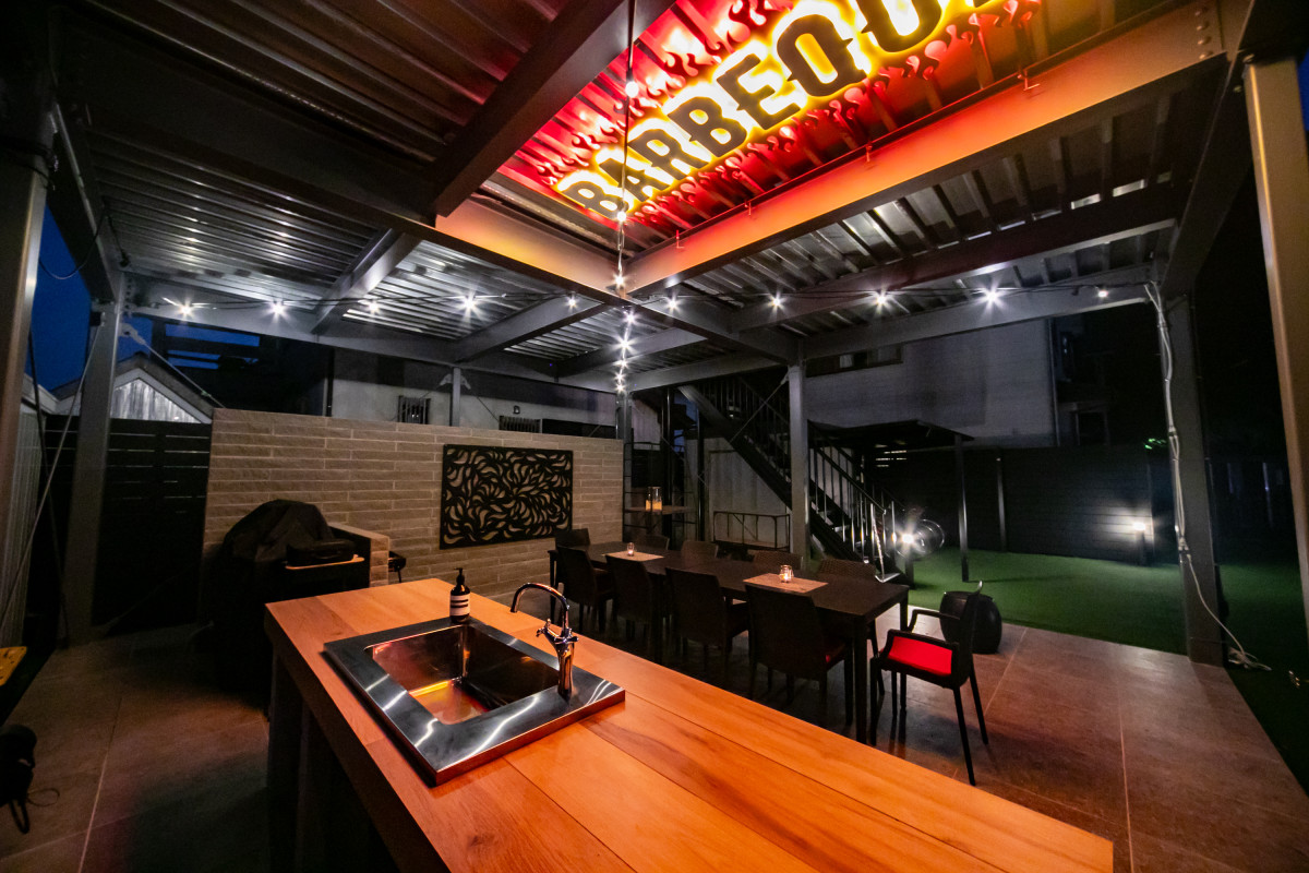 最大の魅力は、約160坪の広大なドッグラン。大型犬も走り回れる圧倒的な広さがあり、多頭飼いや犬友とのグループ旅行にもぴったりです。屋外にはバレルサウナやジャグジー、屋根付きのBBQガーデンを備え、本格的なリゾート気分を味わえます。